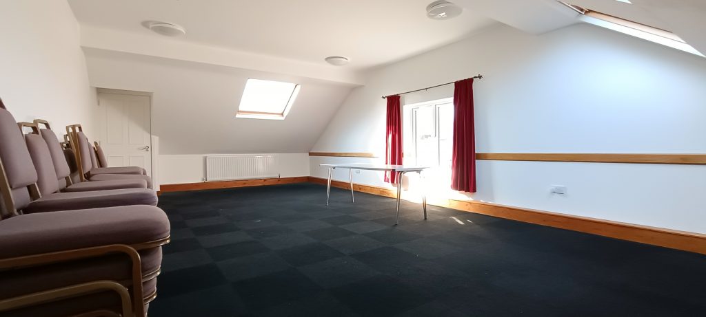 The Treetop room is above the Oakroom and reached by stairs (there is no lift). It is 9m wide x 4.8m long but the sloping ceilings give it a normal standing height area of 6m width x 4.8m long.